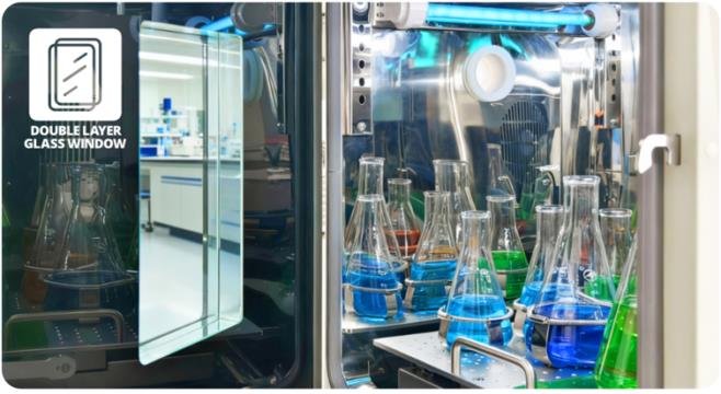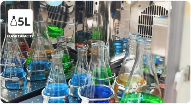 Chamber capacity supports 2 × 5L Erlenmeyer flasks.